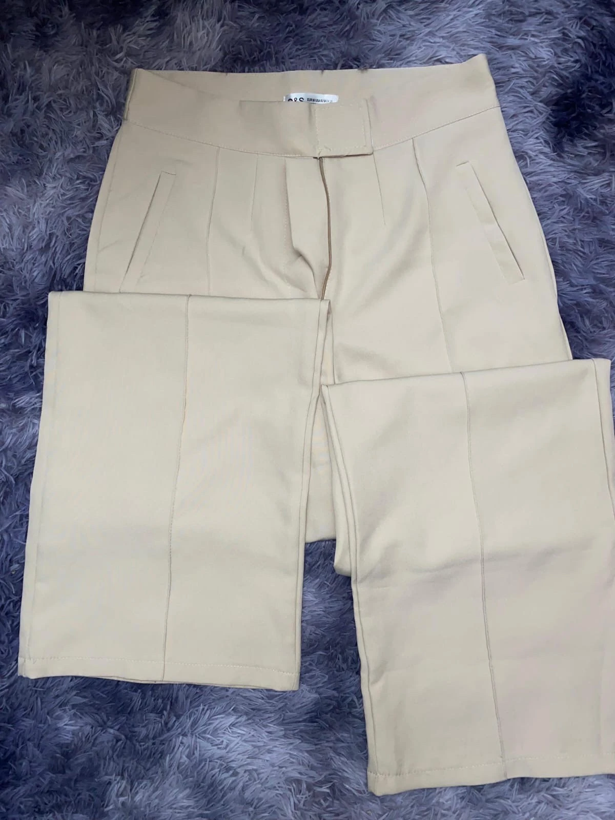 Pantalon beige lisse à plis frontaux. Doté de poches latérales et d'une taille plate. Coupe taille haute, jambe large.