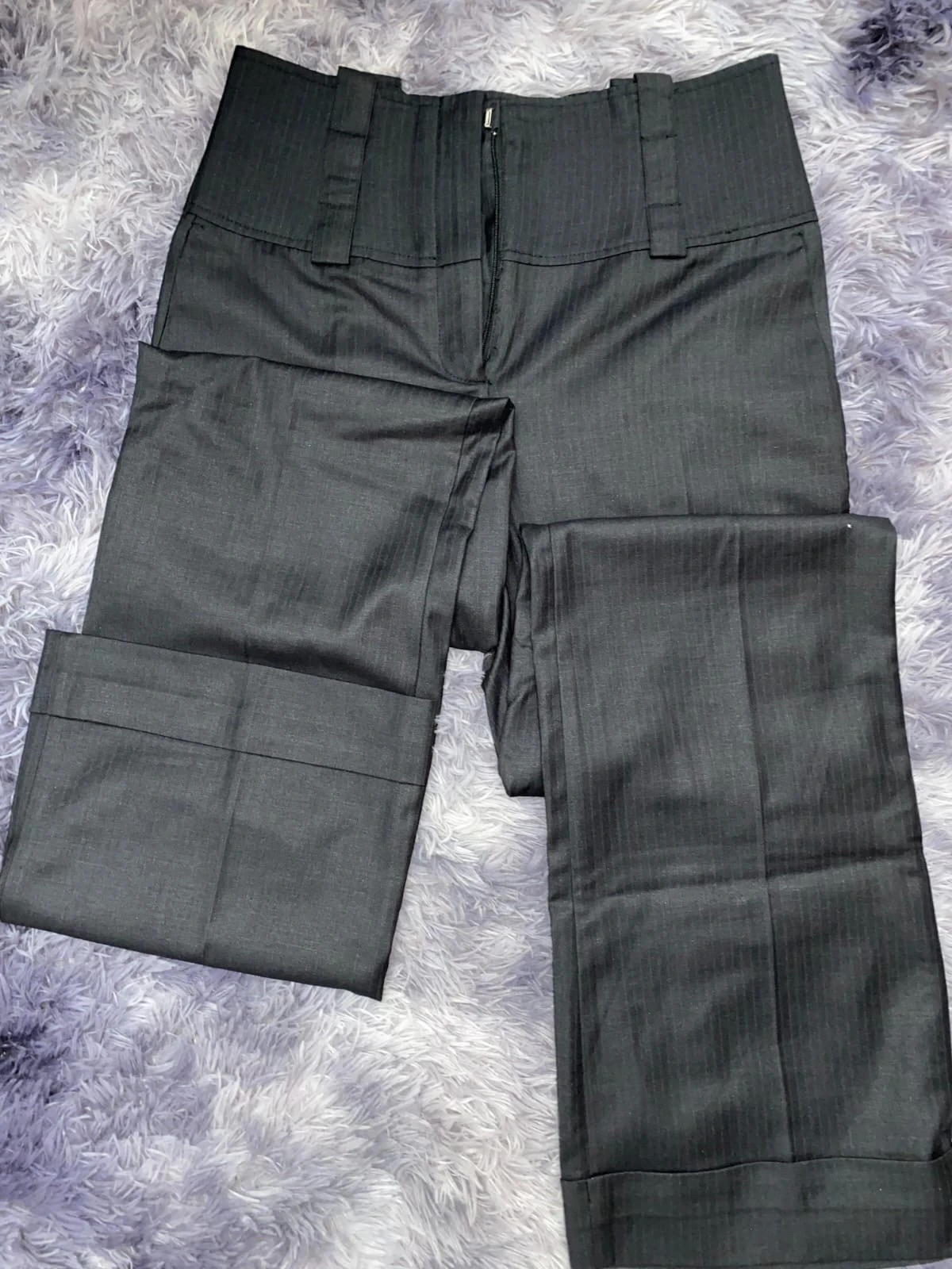Pantalon gris foncé taille haute avec fines rayures verticales. Dispose d'une large ceinture avec passants et fermeture éclair frontale. Jambes larges avec ourlets retroussés.