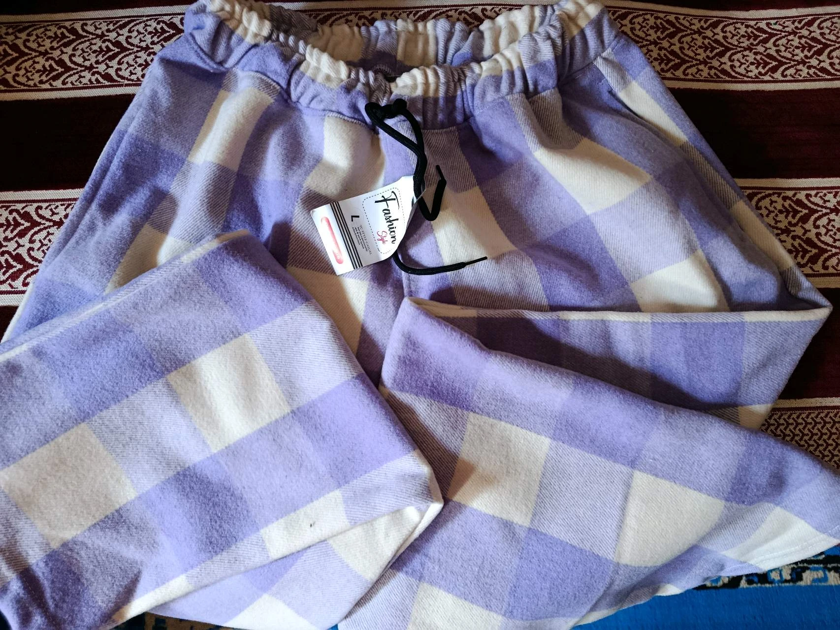 Pantalon à motif vichy lavande et blanc. Tissu doux et tissé, taille élastiquée.