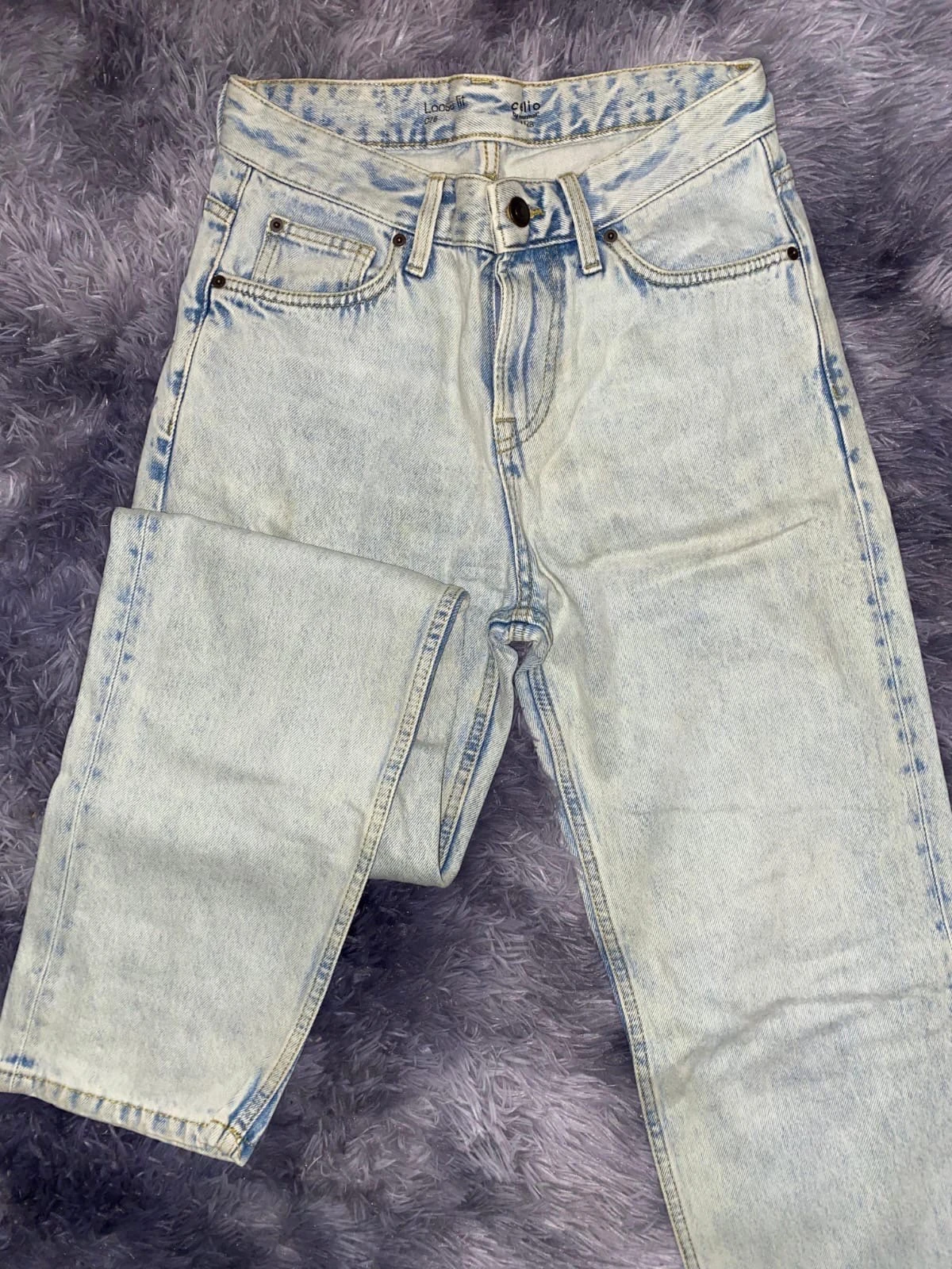 Jean en denim bleu pâle. Coupe ample avec fermeture boutonnée. Dispose de poches avant et une poche monnaie. Texture délavée est visible.