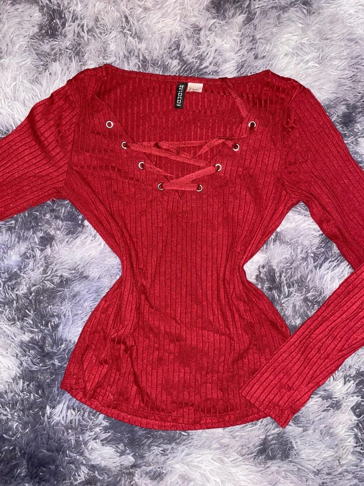 Haut rouge en tricot côtelé. Manches longues, encolure large. Laçage frontal avec œillets argentés. Coupe ajustée.