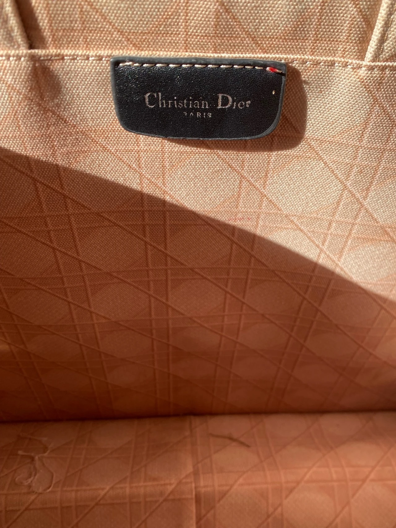Sac fourre-tout en tissu beige clair avec deux poignées. Présente une texture quadrillée et le marquage 'Christian Dior Paris'. Forme rectangulaire structurée.
