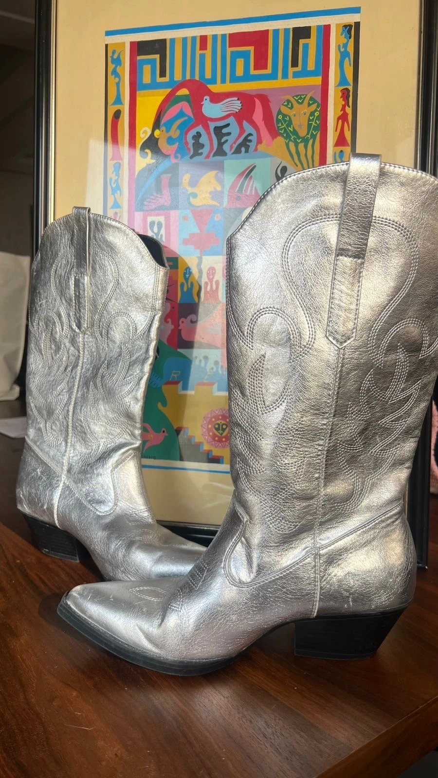 Bottes style cowboy élégantes en finition argentée brillante, décorées de broderies raffinées. Dotées d’un talon carré confortable et d’un bout légèrement pointu, elles offrent un parfait équilibre entre style et confort. Idéales pour un look moderne, audacieux et tendance, aussi bien en journée qu’en soirée.