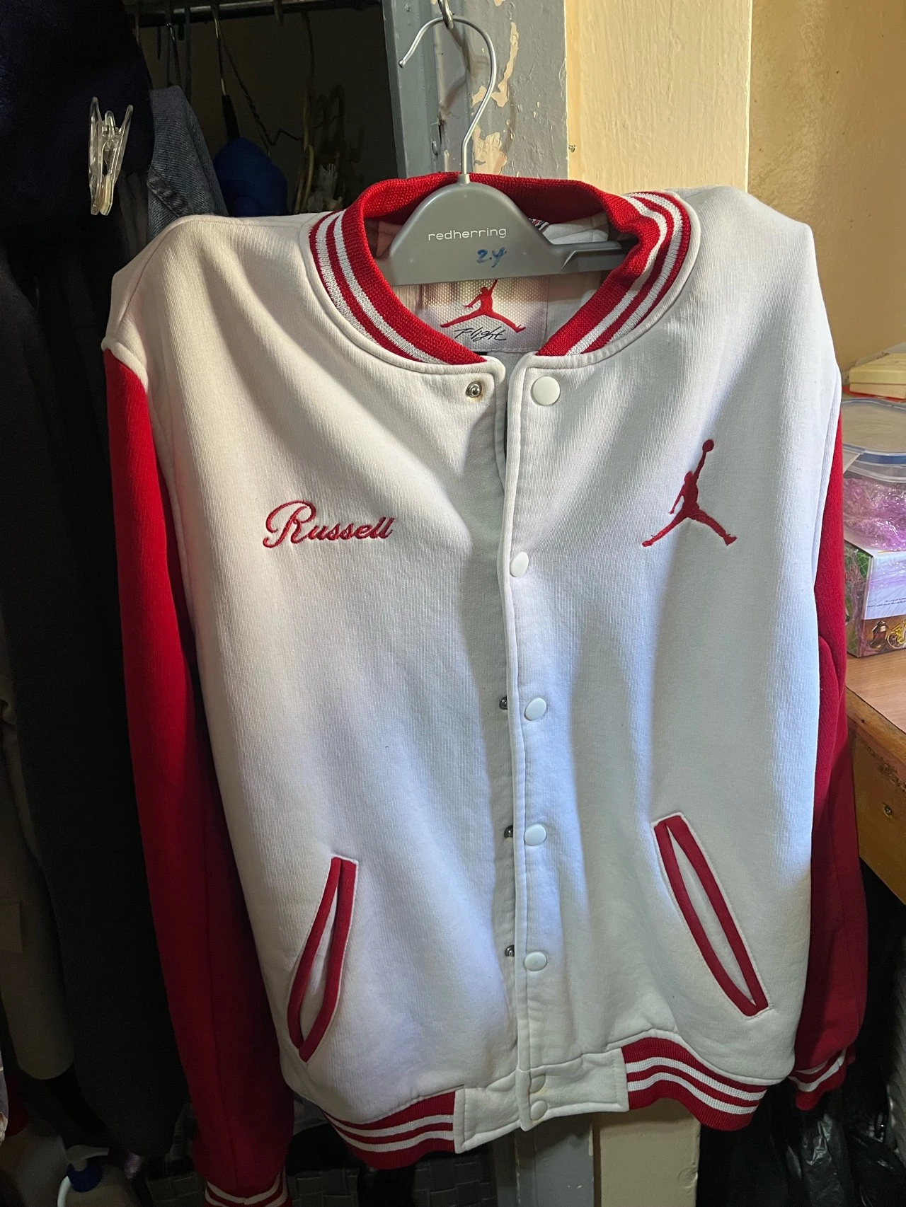 Veste universitaire crème et rouge à boutons-pression. Col, poignets et ourlet côtelés. Logo Jumpman et "Russell" brodés. Comprend une poche intérieure.